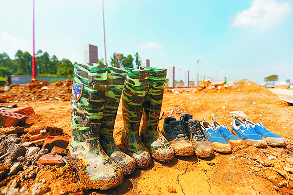 看著記者們“毫無準備”,王剛拿來了膠鞋和礦泉水,指了指“你們這樣的鞋,進去走上一圈就報廢了,工地上容易中暑,要多喝水。”做完準備工作,王剛帶著我們,像平常一樣開始了工地巡查。“水排得如何了,一定要注意安全”“圍墻的勾縫要更飽滿一些。”每到一處,王剛都要仔細查看和了解,一旦發現不合格的地方,現場與施工方負責人員溝通協調,提出整改意見。