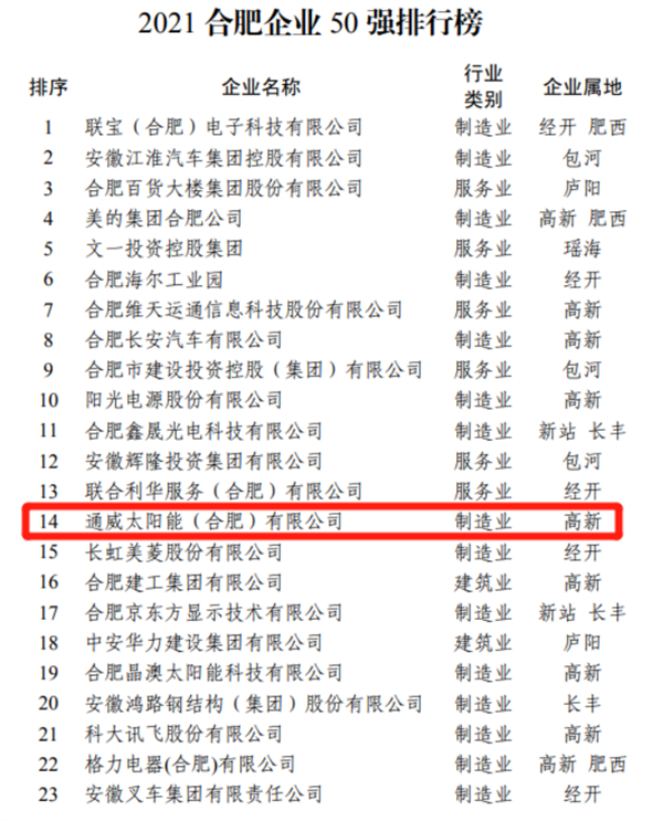 通威太陽(yáng)能合肥基地榮列2021合肥企業(yè)50強(qiáng)、合肥制造業(yè)企業(yè)30強(qiáng)、合肥全國(guó)行業(yè)領(lǐng)軍企業(yè)榜單