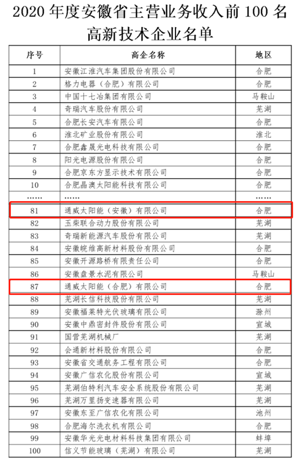 通威太陽(yáng)能合肥基地榮列“2020年度安徽省主營(yíng)業(yè)務(wù)收入前100名高新技術(shù)企業(yè)”榜單