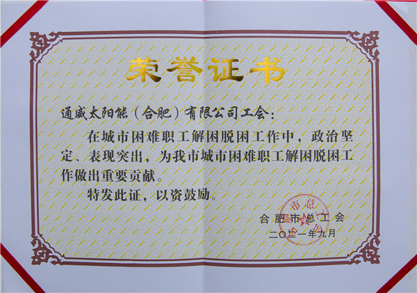 通威太陽能合肥基地工會榮獲“合肥市城市困難職工解困脫困工作中做出重要貢獻(xiàn)的集體”稱號