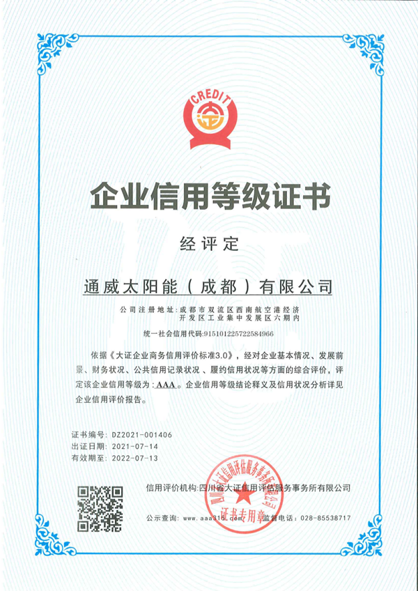 通威太陽能雙流基地獲評“AAA級企業(yè)信用等級”證書