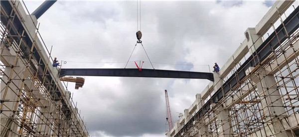 云南通威首個還原車間第一根屋面梁順利吊裝