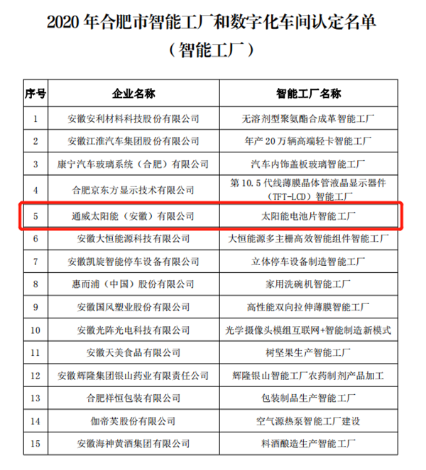 通威太陽能榮獲“合肥市智能工廠”榮譽稱號
