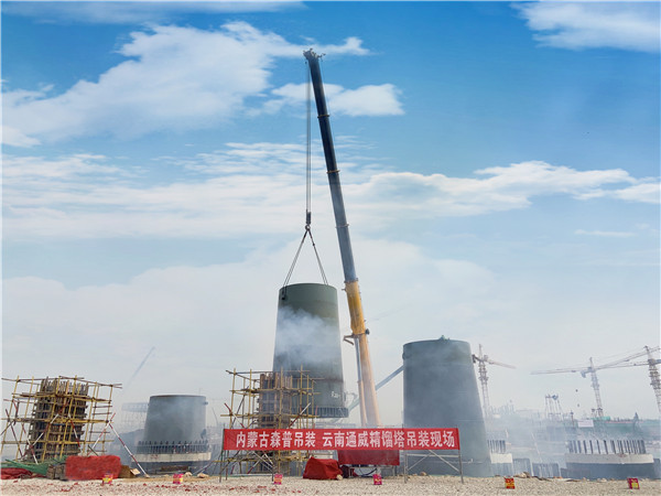 云南通威一期項目精餾塔首套裙座吊裝工作圓滿成功