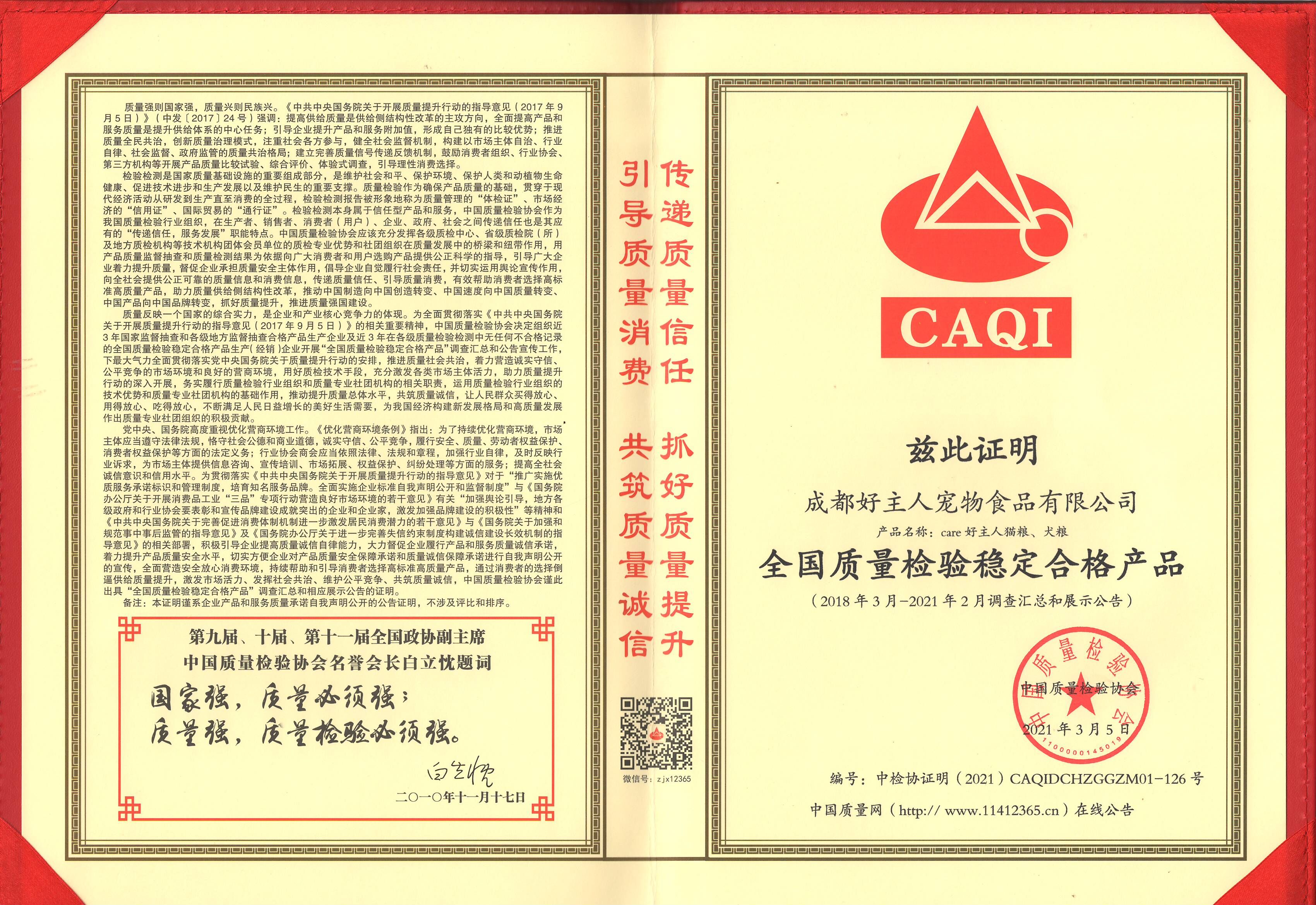 好主人公司獲“全國質檢穩定合格產品”專用標識