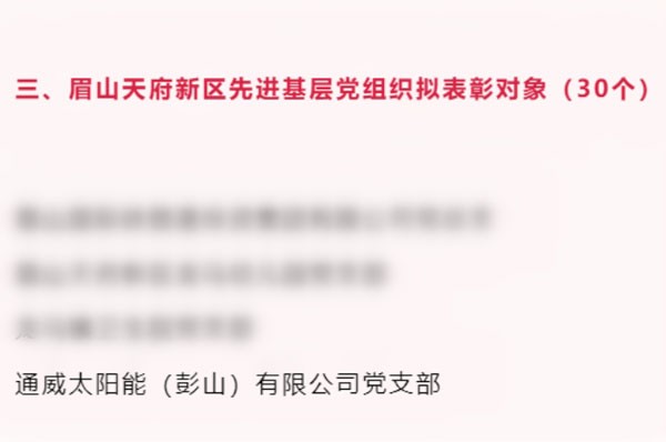 通威太陽(yáng)能(彭山)有限公司黨支部榮獲眉山天府新區(qū)“先進(jìn)基層黨組織”榮譽(yù)稱號(hào)
