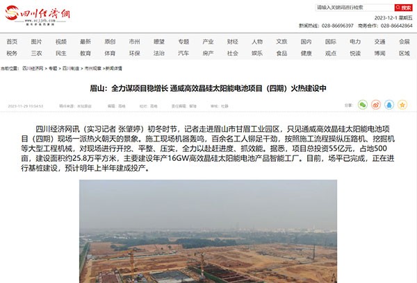 四川經濟網聚焦通威太陽能眉山基地四期項目建設