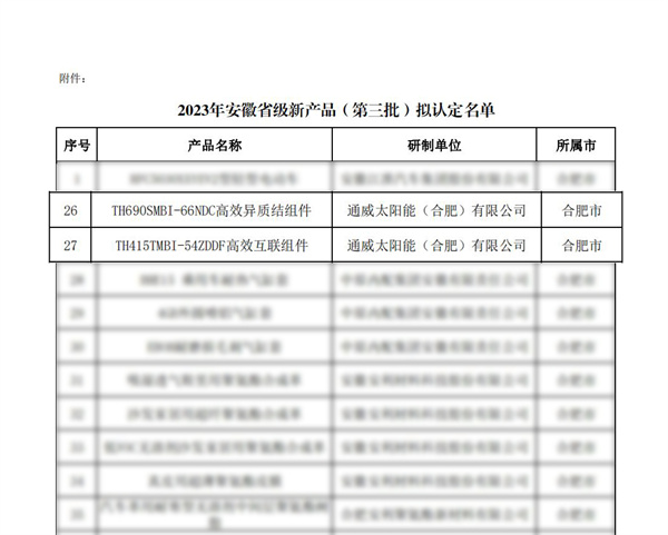 通威太陽能(合肥)有限公司兩項產品榮獲安徽省新產品稱號