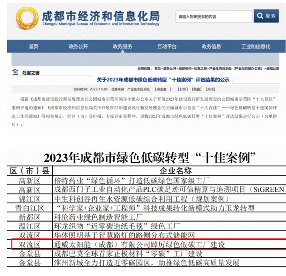 通威太陽能雙流基地榮列2023年成都市綠色低碳轉型“十佳案例”名單