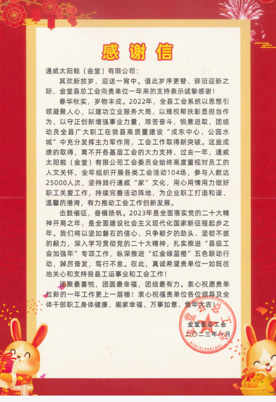 金堂縣總工會發來感謝信,點贊通威太陽能金堂基地