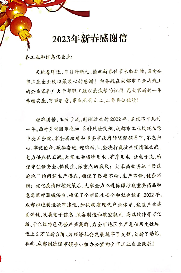 成都制造強市領導小組辦公室發來感謝信鼓勵通威太陽能再創佳績