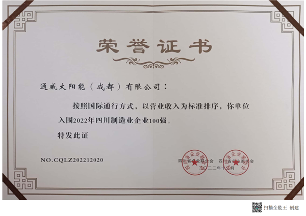 通威太陽(yáng)能雙流基地獲“2022年四川制造業(yè)百?gòu)?qiáng)企業(yè)”殊榮