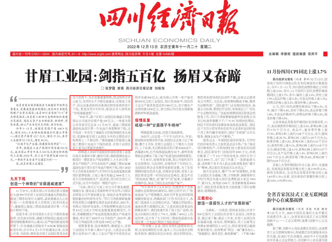 《四川經濟日報》聚焦通威太陽能:九天下線,創造神奇的“甘眉通威速度”