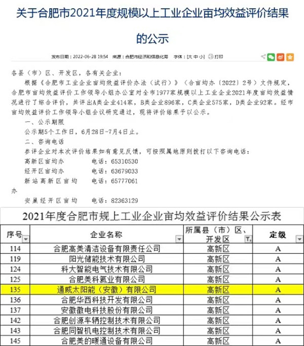 通威太陽(yáng)能(安徽)有限公司榮獲合肥市規(guī)上工業(yè)畝均效益評(píng)價(jià)A類企業(yè)