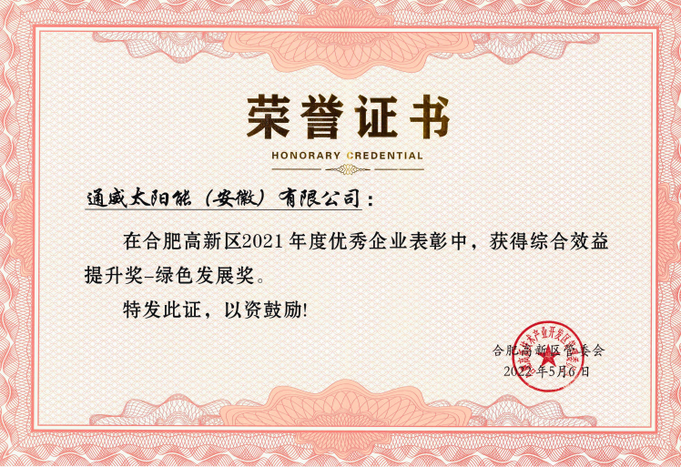 通威太陽能(安徽)有限公司榮獲合肥高新區(qū)2021年度“綜合效益提升獎-綠色發(fā)展獎”