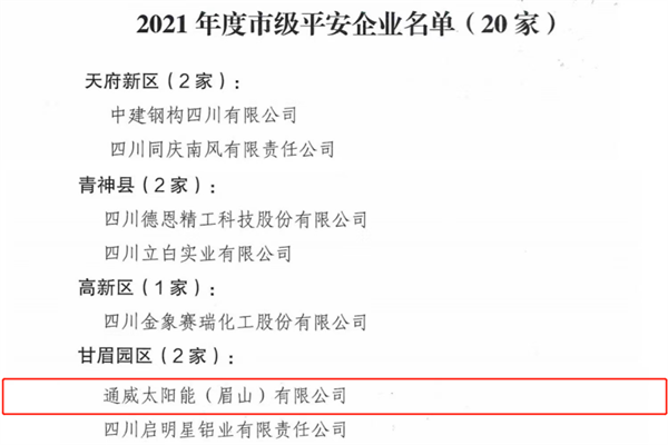 通威太陽能眉山基地榮獲眉山市2021年度平安企業稱號