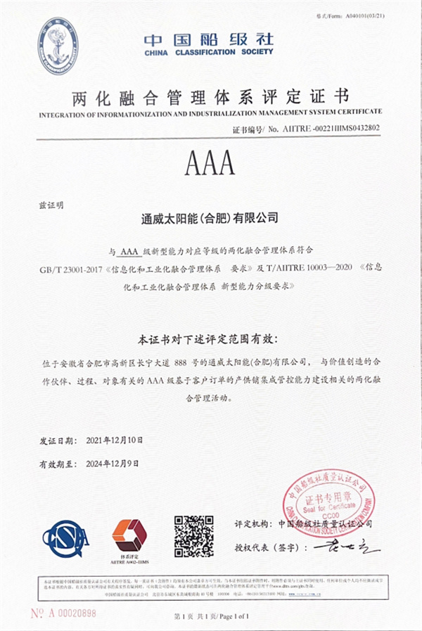 通威太陽能合肥基地榮獲國家兩化融合管理體系評定證書