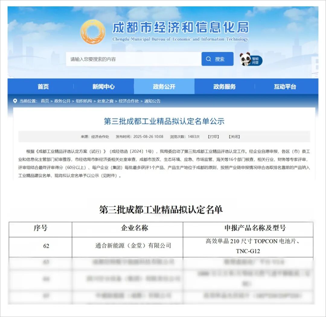 通合新能源(金堂)有限公司入選“第三批成都工業(yè)精品”認定名單