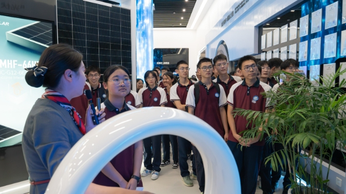 在鹽城基地科技展廳中,350名青少年分成了7批次在導覽員的講解中逐步探索光伏產業的魅力,他們通過學習新能源產業鏈、認識多種新能源材料、真人體驗VR互動、觀看3D全景放映、觀摩新能源產業生產線,對光伏組件的生產步驟有了更深的了解,對可持續再生能源在社會的運用中有了更多的認識,并在心中埋下了光伏的種子。一位青少年在參觀中說:“我爸爸是個風力發電工作者,光和風力一樣都是清潔能源,以后我也想成為一名光伏工作者,為祖國強大奉獻自己的力量。”
