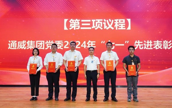 會上,全體黨員首先莊重重溫入黨誓詞,并觀看“七一”建黨宣傳片,致敬中國共產黨百年征程。隨后,主持人宣讀通威集團黨委2024年“七一”優秀黨員名單,姚騫書記現場為他們頒獎并合影留念。他勉勵黨員同志們要做好表率作用,遇到困難迎難而上,奮勇爭先;鼓勵骨干流動黨員積極將組織關系轉入公司,壯大黨員隊伍,為明年升級黨委做好人才儲備和建設準備。