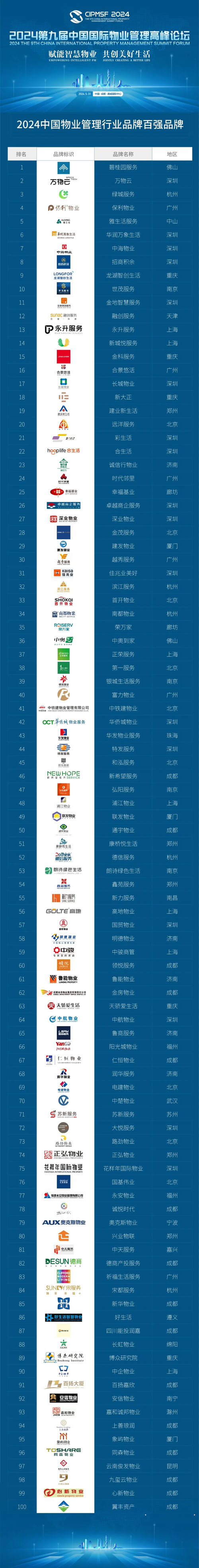 “2024中國物業(yè)管理行業(yè)百強品牌”名單
