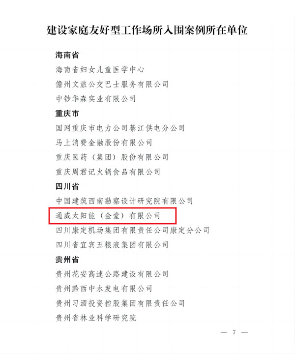 近日,中華全國總工會(huì)、人力資源社會(huì)保障部、國家衛(wèi)生健康委、中國企業(yè)聯(lián)合會(huì)/中國企業(yè)家協(xié)會(huì)、中華全國工商業(yè)聯(lián)合會(huì)聯(lián)合發(fā)布《關(guān)于建設(shè)家庭友好型工作場所案例征集結(jié)果的通報(bào)》。本次征集活動(dòng)在全國范圍內(nèi)共征集案例175個(gè),經(jīng)篩選和評(píng)審,產(chǎn)生100個(gè)入圍案例。四川4個(gè)案例上榜,其中通威太陽能(金堂)有限公司報(bào)送的案例《光伏筑夢 紅色聚能 幸福建家》成功入圍。