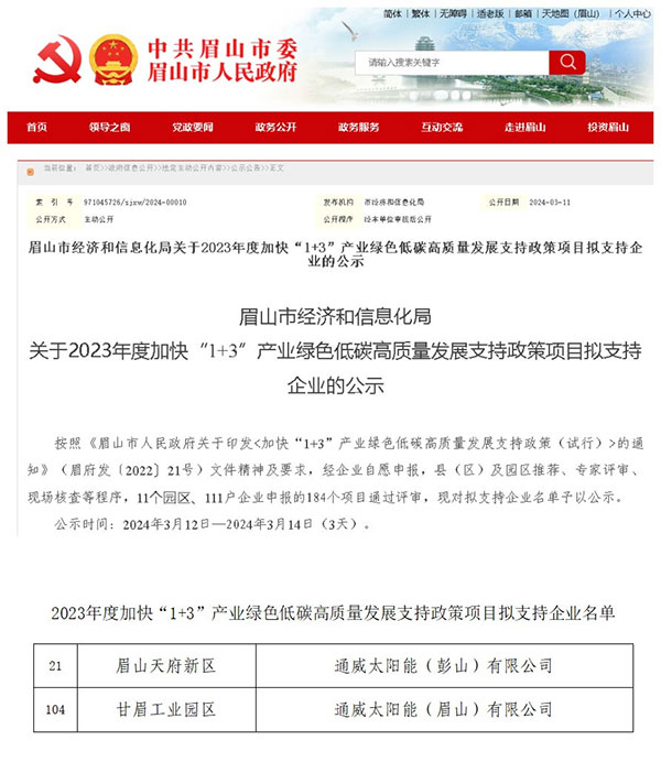 3月12日,中共眉山市委市政府官方網站正式公示了《2023年度加快“1+3”產業綠色低碳高質量發展支持政策項目擬支持企業名單》,通威太陽能眉山基地、彭山基地經自主申報,通過縣(區)及園區推薦、專家評審等層層審核,成功入列其中。