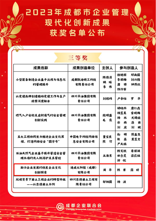 2月5日,成都企業(yè)聯(lián)合會(huì)公布了2023年成都市企業(yè)管理現(xiàn)代化創(chuàng)新成果獲獎(jiǎng)名單,通威太陽(yáng)能雙流基地憑借在企業(yè)創(chuàng)新管理方面的突出成績(jī)榮獲“2023年成都市企業(yè)管理現(xiàn)代化創(chuàng)新成果三等獎(jiǎng)”。