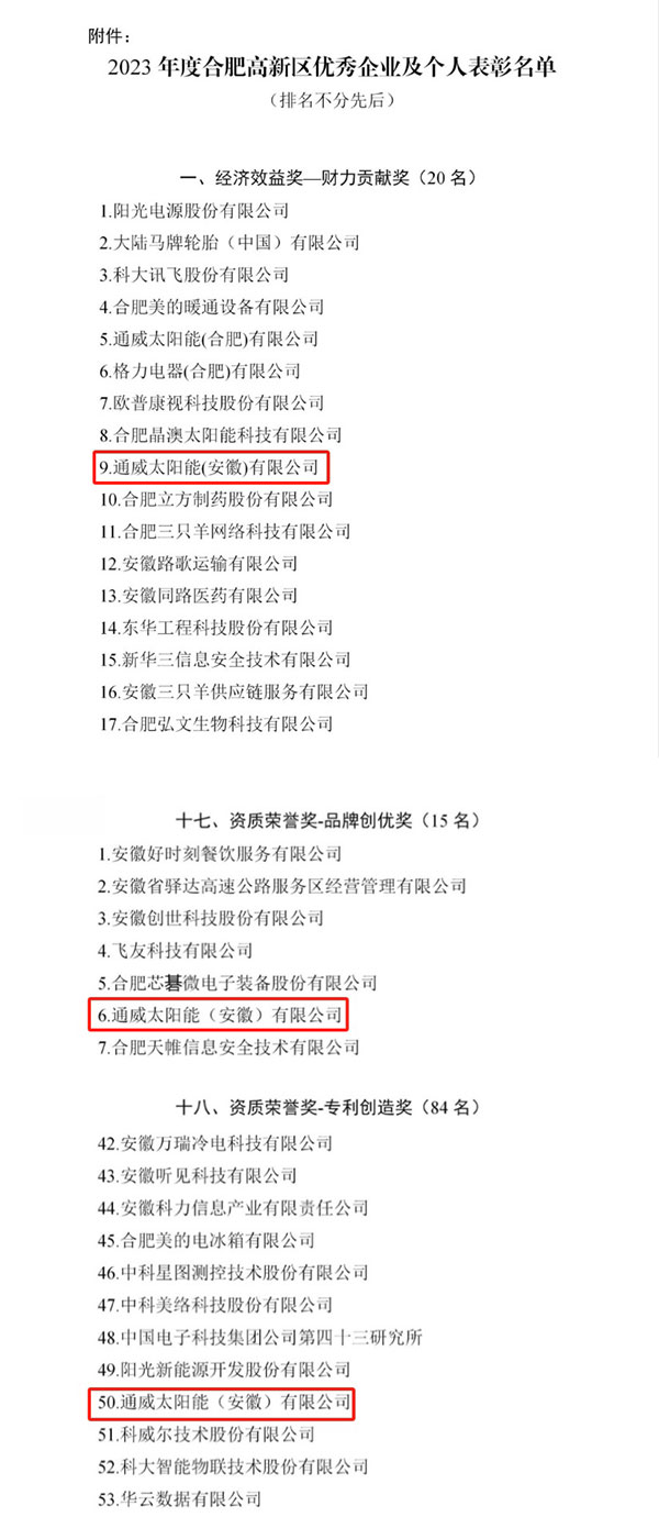 近日,合肥高新技術產業開發區管理委員會在官網發布了《關于合肥高新區2023年度擬表彰獎勵項目的公示》,通威太陽能安徽公司憑借卓越的業績和突出的貢獻,榮獲“財力貢獻獎”“品牌創優獎”及“專利創優獎”多項表彰獎勵,再次彰顯了公司在高質量發展道路上的堅實步伐和輝煌成就。