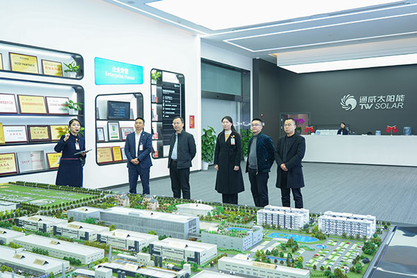 在通威太陽能智能制造展廳,邢志剛董事長一行聽取通威太陽能發展歷程、項目建設、產能布局及取得的榮譽獎項等相關情況介紹,詳細了解了通威太陽能雙流基地項目建設進度、項目投產情況、產能規劃以及各板塊產業布局情況。