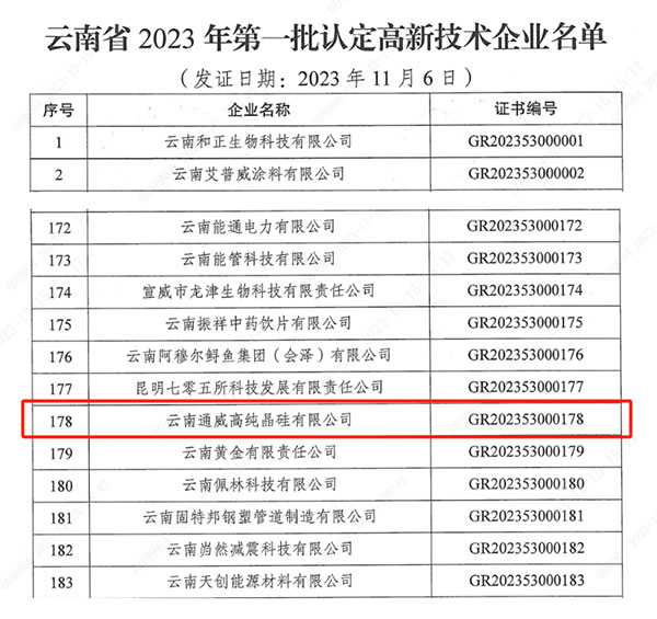 近日,全國高新技術企業認定管理工作領導小組辦公室公示云南省2023年第一批高新技術企業,云南通威通過認定,榮獲“高新技術企業”榮譽稱號。
