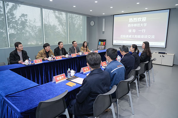 12月14日,西華師范大學物理與天文學院黨委書記陳金祥、黨委副書記鄧宗文等一行五人蒞臨通威太陽能雙流基地參觀交流,通威太陽能總經理助理陳君攜雙流基地人事行政部相關負責人熱情接待并座談。
