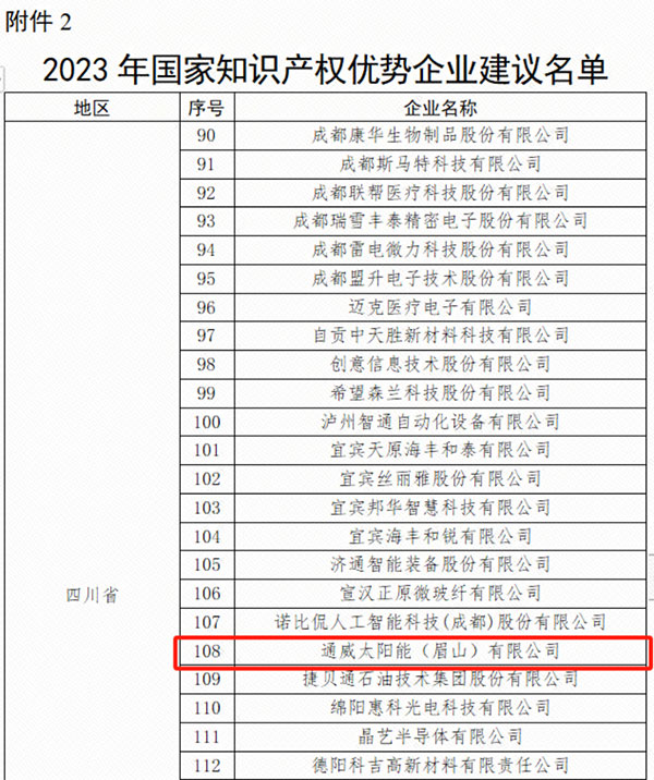 11月13日,國(guó)家知識(shí)產(chǎn)權(quán)局發(fā)布了《關(guān)于2023年度國(guó)家知識(shí)產(chǎn)權(quán)優(yōu)勢(shì)企業(yè)和示范企業(yè)評(píng)定結(jié)果的公示》,通威太陽(yáng)能眉山基地憑借卓越的知識(shí)產(chǎn)權(quán)實(shí)力,成功獲評(píng)“國(guó)家知識(shí)產(chǎn)權(quán)優(yōu)勢(shì)企業(yè)”。
