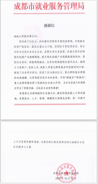 近日,通威太陽能收到一封來自成都市就業(yè)服務(wù)管理局的感謝信,感謝通威太陽能為成都市“穩(wěn)就業(yè)”“保就業(yè)”作出的突出貢獻。