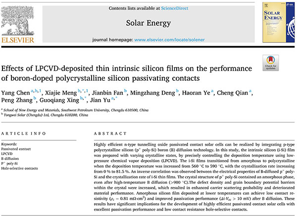 在不斷追求太陽能技術創新的道路上,通威太陽能再次取得了令人振奮的突破性成果。10月11日,通威太陽能產學研合作成果在國際知名學術期刊《Solar Energy》發表,題為“Effects of LPCVD-deposited thin intrinsic silicon films on the performance of boron-doped polycrystalline silicon passivating contacts”。