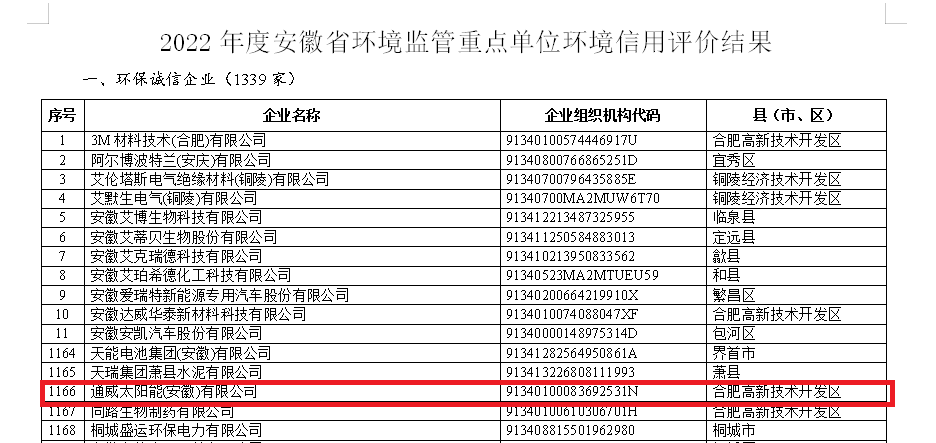 通威太陽能安徽公司榮列“2022年度安徽省環保誠信企業”榜單