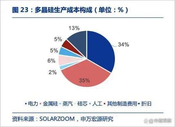 拆解硅料生產成本,電力、金屬硅、蒸汽、硅芯、人工、其他制造費用、折舊占比分別為34%、35%、2%、6%、5%、5%、13%。其中,電力、硅粉和折舊占比最高。