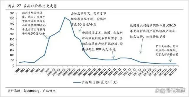 回顧多晶硅產業的發展歷史,世紀之初,光伏新能源產業開始崛起,由于下游組件廠瘋狂擴張,對上游需求持續暴漲,引發硅料價格在2007年底飆升到每公斤近500美元的歷史高點。