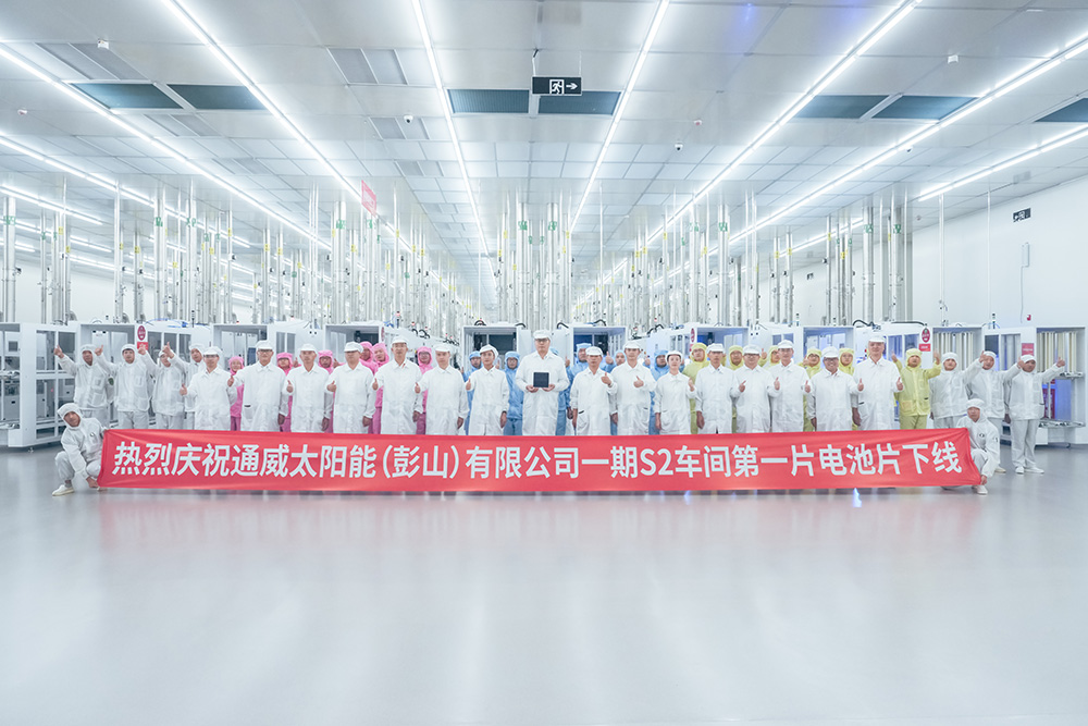8月14日,通威太陽能彭山基地一期項目S2高效晶硅電池車間迎來了激動人心的一刻。在熱烈的掌聲和歡呼聲中,彭山基地一期項目S2車間第一片電池片順利下線,通威太陽能彭山基地總經理助理顧峰攜中干團隊、員工代表齊聚一堂,共同見證了這一里程碑時刻。
