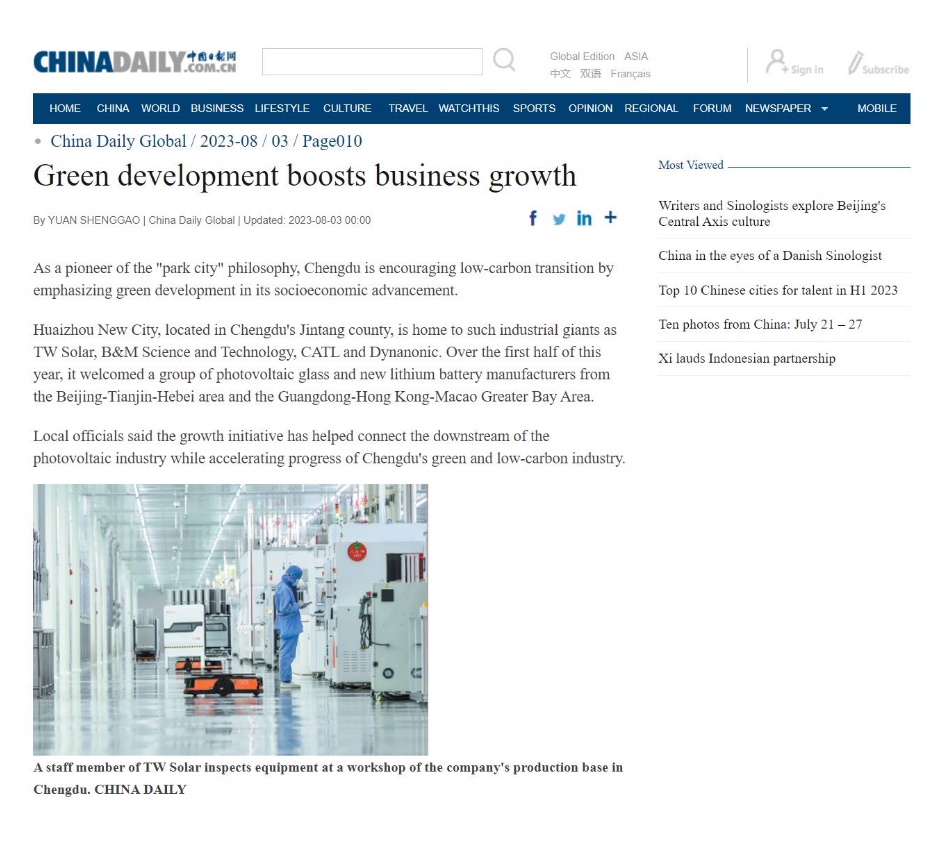 83日,中國日報以《Green development boosts business growth》為題,聚焦通威太陽能助力成都綠色經(jīng)濟發(fā)展,充分展現(xiàn)引領(lǐng)行業(yè)的通威速度。