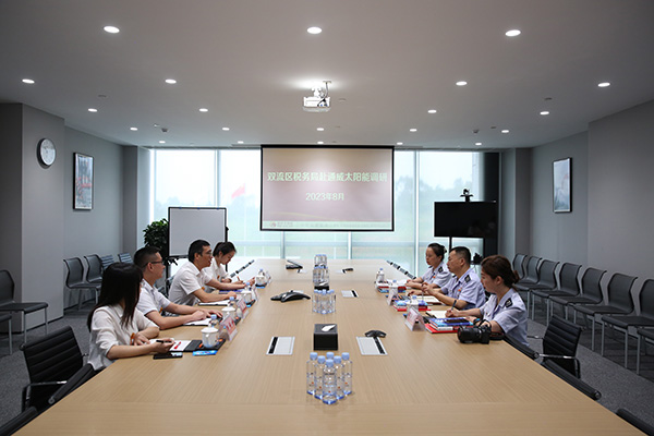 82日,雙流區稅務局局長馮文勝一行蒞臨通威太陽能雙流基地參觀調研,通威太陽能副總經理宋梟熱情接待并座談。