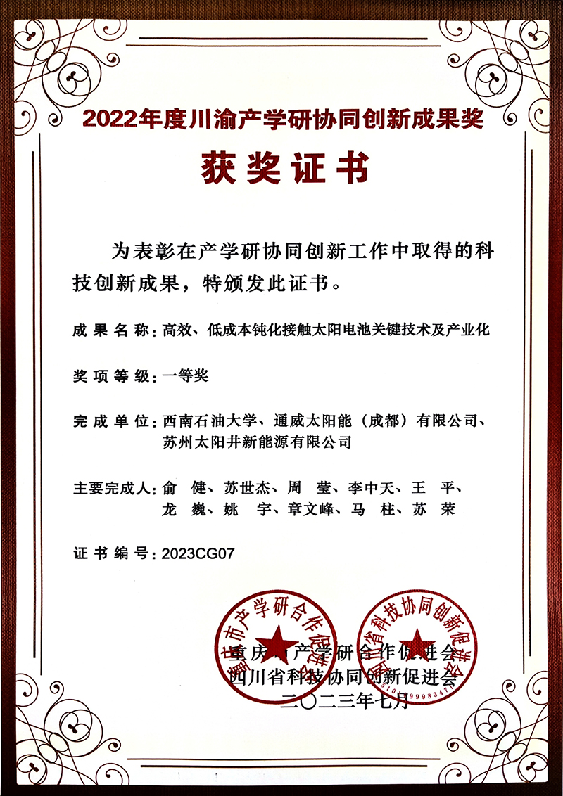 近日,四川省科技協(xié)同創(chuàng)新促進會與重慶市產(chǎn)學(xué)研合作促進會聯(lián)合印發(fā)《關(guān)于2022年度川渝產(chǎn)學(xué)研協(xié)同創(chuàng)新成果獎評選結(jié)果的通知》。通威太陽能(成都)有限公司與合作單位共同申報的《高效、低成本鈍化接觸太陽電池關(guān)鍵技術(shù)及產(chǎn)業(yè)化》從50余個項目中脫穎而出,榮獲“2022年度川渝產(chǎn)學(xué)研協(xié)同創(chuàng)新成果獎”一等獎。