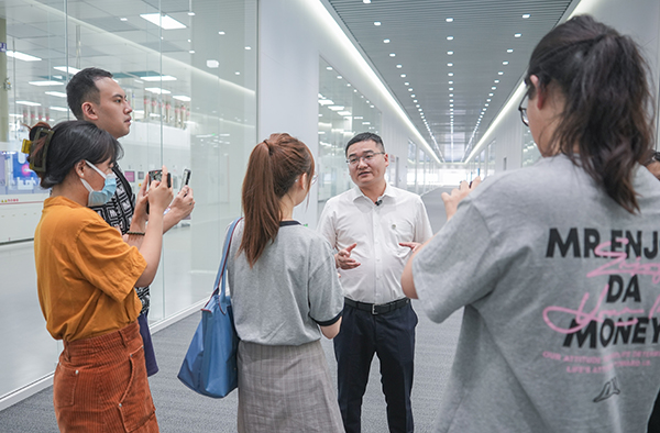 活動現場,紅星新聞網、央廣網、四川發布、成都電視臺等多家媒體單位深入一線對基地建設、生產及智能制造等多方面進行參觀體驗。過程中,通威太陽能金堂基地總經理助理龐三鳳就TPC技術革新、GW級異質結電池和TOPCon 新技術量產研發攻關等問題向媒體記者作出詳細解答。