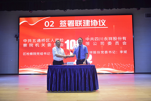 為深入探索檢企黨建聯(lián)建新思路、新模式,搭建黨建交流新平臺,推動黨建工作與檢察業(yè)務工作、企業(yè)生產經營深度融合,助力營造優(yōu)質法治營商環(huán)境,推動五通橋經濟社會高質量發(fā)展,7月7日,中共五通橋區(qū)人民檢察院機關黨委、中共四川永祥股份有限公司黨委“檢企聯(lián)建聚合力 黨建引領促發(fā)展”黨建聯(lián)建活動順利舉行。五通橋區(qū)檢察院黨組書記、檢察長蘇登科,區(qū)檢察院黨組成員、副檢察長楊科,永祥股份黨委書記、總經理李斌,永祥股份黨委副書記、永祥新能源黨支部副書記、永祥股份副總經理羅周出席,五通橋區(qū)檢察院、永祥股份黨員同志參加。