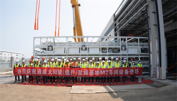 自5月25日,通威太陽能(組件)鹽城基地首件下線后,持續穩定生產運行,6月13日,鹽城基地生產的首批太陽能組件成功完成各項質檢,并順利裝車發運交付客戶,標志著鹽城基地產能交付正式啟動。6月15日,M2車間設備如期進場,為基地達產、達效注入了新動能。