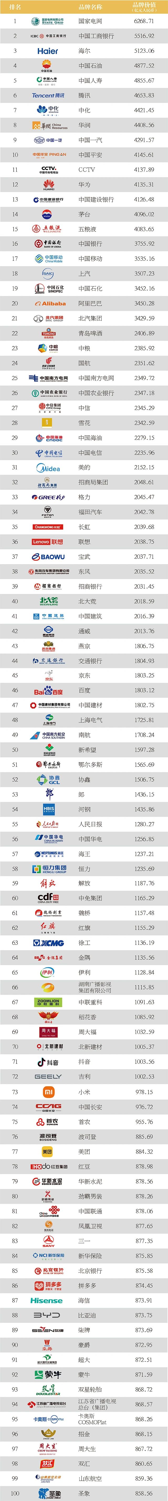 2023年中國(guó)最值錢的100個(gè)品牌