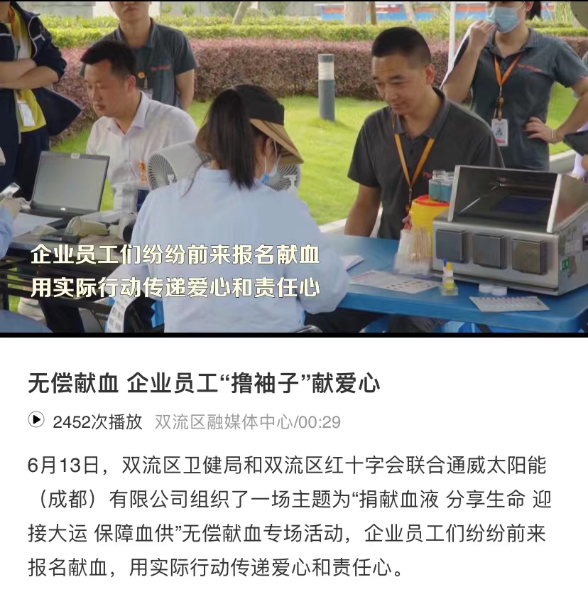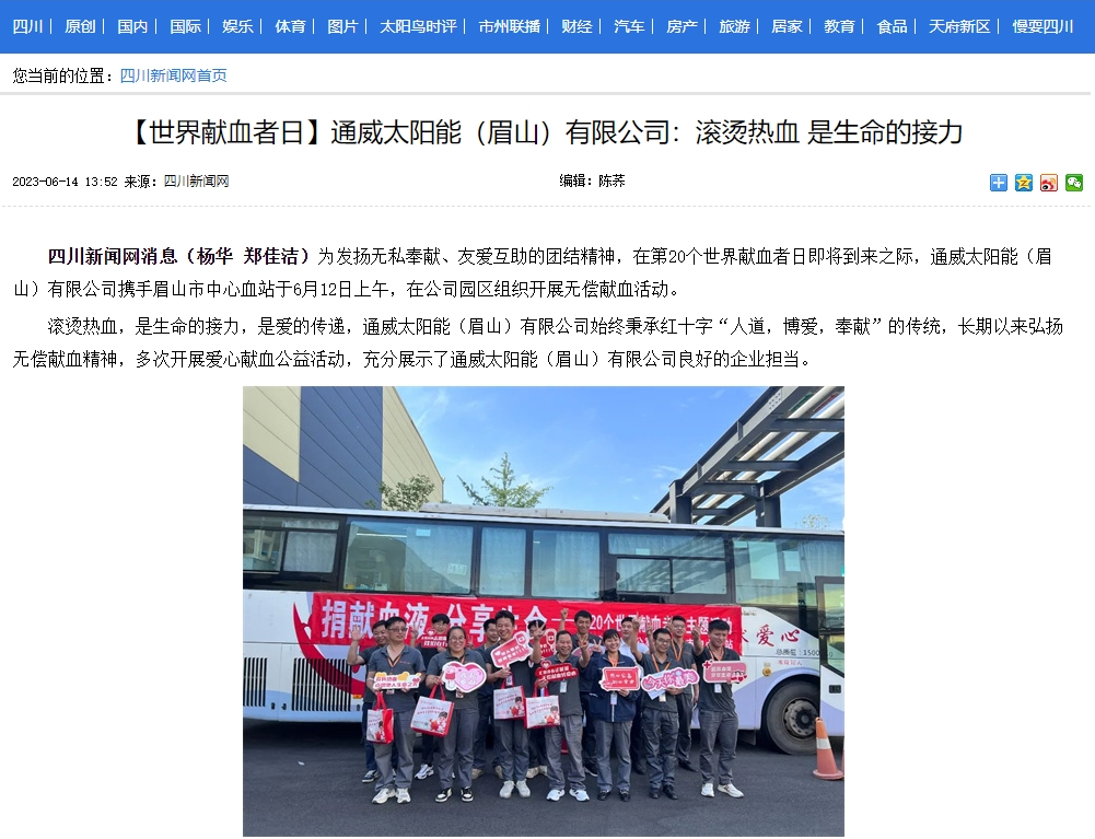 613日及14日,四川新聞網和雙流發布分別以《通威太陽能(眉山)有限公司:滾燙熱血 是生命的接力》《無償獻血:企業員工“擼袖子”獻愛心》為題,聚焦通威太陽能職工積極參與愛心獻血公益活動。