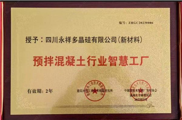 2023年5月,在建筑材料工業技術情報研究所、中國散裝水泥推廣發展協會混凝土專業委員會組織開展的“預拌混凝土行業智慧工廠”評價活動中,永祥商砼在預拌混凝土企業中脫穎而出,榮獲“預拌混凝土行業智慧工廠”稱號。