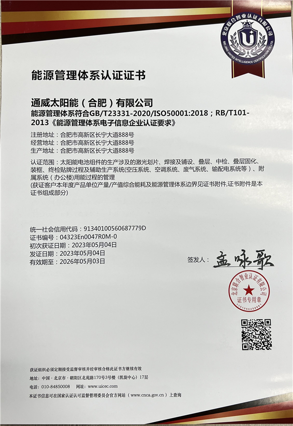 近日,通威太陽能(合肥)有限公司榮獲ISO50001能源管理體系認(rèn)證證書。ISO50001標(biāo)準(zhǔn)對持續(xù)改善能源效率、實(shí)現(xiàn)能源成本控制和減少環(huán)境污染等方面具有重要意義,該標(biāo)準(zhǔn)的實(shí)施可以幫助組織建立可持續(xù)的能源管理體系,優(yōu)化能源使用,降低成本和環(huán)境風(fēng)險(xiǎn),提高競爭力,為企業(yè)未來的發(fā)展提供動(dòng)力。