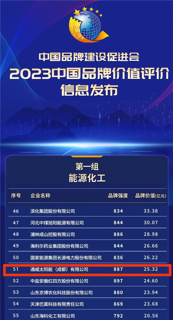 通威太陽能雙流基地位列2023中國品牌價(jià)值評(píng)價(jià)“能源化工”組榜單第51位